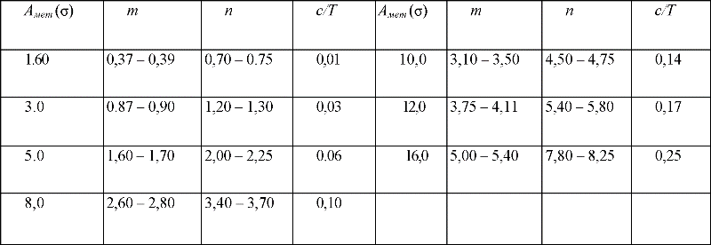 Рис. 3.2. Кривые распределения контролируемых параметров, с учётом погрешностей измерения Наложение кривых умет и yтех вызывает искажение кривой распределения у ( мет, тех), в результате этого появляются области вероятностей m и n, обусловливающие выход размера за границу допуска на величину с. Большее отношение мет/T, означающее более точный технологический процесс, приводит к меньшему числу неправильно принятых деталей по сравнению с неправильно забракованными, так как m/n = 0,1 1,1. Наибольшее смещение с находится в пределах (1,5 1,73) мет. Параметры m, n и с можно определить по табл. 3.1, при этом рекомендуется принимать для квалитетов IT2 IT7 Aмет ( ) = 0,16; для квалитетов IT 8, IT 9 Aмет ( ) = 0,12, для квалитета IT10 и грубее Aмет ( ) = 0,1. В таблице 3.1 первый ряд значений m, n и c соответствует закону нормального распределения погрешности измерения, второй ряд - закону равной вероятности. При неизвестном законе распределения погрешности измерения значения m, n и c можно определять как среднее из значений 1-го и 2-го рядов. Предельные значения параметров m, n и с/T учитывают влияние только случайной составляющей погрешности измерения. Значения m, n и c даются в литературе также в виде номограмм. ГОСТ 8.051-81 предусматривает два способа установления приемочных границ первый способ - приемочные границы устанавливаются совпадающими с предельными размерами, второй способ - приемочные границы смещают внутрь относительно предельных размеров. Таблица 3.1. Значения относительной погрешности измерения для разных законов распределения