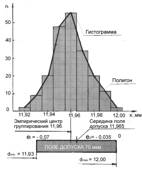 Характер рассеяния значений случайной величины, которой в рассматриваемом примере является действительный размер вала, более наглядно определяется гистограммой, состоящей из прямоугольников, высота которых равна частоте, а основание величине интервала. Рассеяние определяется также эмпирической кривой распределения, которую называют полигоном распределения (рис. 3.5). Графическое представление результатов при ручной обработке удобно выполнять на миллиметровой бумаге. По оси абсцисс откладывают интервалы действительных размеров валов, а по оси ординат - высоты прямоугольников равные частотам. Расстояния по оси абсцисс и по оси ординат для лучшей наглядности рекомендуется откладывать в отношении равном 0,8 1,0. На рис. 3.5 представлены полигон и гистограмма распределения размеров валов, также расположение поля допуска отражающего требования к точности по чертежу, как можно видеть эмпирические результаты несколько не совпадают с требованиями технической документации, что в принципе так и должно быть. Например, несовпадение координаты середины поля допуска с эмпирическим центром группирования равно 0,005 мм, а размах превышает допуск на величину равную 0,09 0,07 = 0,02 мм. Для заключения о годности партии необходимо провести анализ полученных результатов по следующим признакам: