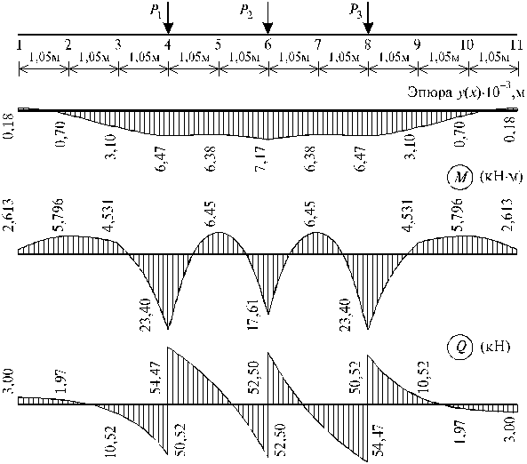 Разбиваем балку на участки в точках 1, 2,..., 11. На балку действует система сосредоточенных грузов Р1 = Р2 = Р3 = 105 кН, приложенных в сечениях 4, 6 и 8 системы (рис.2.7, а).