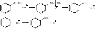 Реакция трансалкилирования. Реакции алкилирования ароматических соединений являются обратимыми. Молекулы полиалкилбенолов могут протонироваться. Образующийся σ-комплекс может либо отщепить протон, либо этильный катион. Образующийся этильный катион далее может прореагировать с молекулой бензола, например: