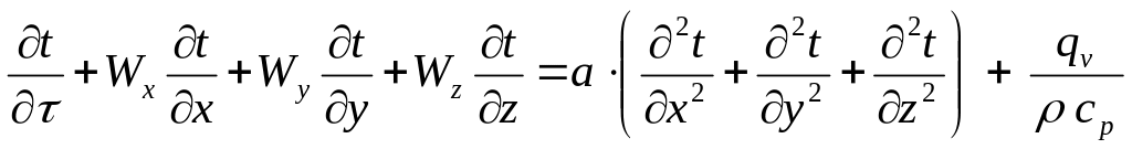дифференциальное уравнение теплопроводности в декартовой системе координат или уравнение Фурье-Кирхгофа для подвижной среды при нестационарном режиме.