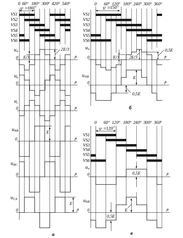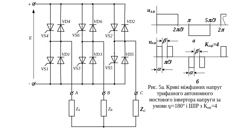 амплітудою Е додатної чи від’ємної полярності створюються під час провідності навхрест розташованих тиристорів двох фаз, що визначають відповідну міжфазну напругу. Так, наприклад, у кривій uAB (рис. 7а) імпульси напруги додатної полярності утворюються під час провідності тиристорів VS3 і VS4, а імпульси напруги від’ємної полярності під час провідності тиристорів VS1 і VS6 (див. рис. 5). Проміжкам паузи в кривих міжфазних напруг відповідають відкриті стани тиристорів двох фаз однієї групи (анодної чи катодної), що формують відповіну напругу. Наприклад, проміжки паузи у кривій uAB виникають під час одночасної провідності тиристорів VS1 і VS3 чи VS4 і VS6.
