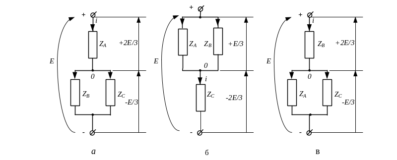 uв = uс = -E/3. У відповідності до напряму протікання струму (входить у вузол чи виходить з вузла) напруга фази А додатня, а напруги фаз В і С – від’ємні (рис. 6а).