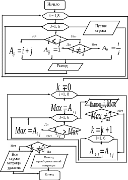 Из выделенных подзадач формирование и вывод матрицы представляет достаточно простой фрагмент, реализующийся вложенным счетным циклом, внутри которого организован разветвляющийся процесс. Нахождение максимального элемента рассмотрено в задаче 2 в данной лабораторной работе. Для удаления строк будем использовать следующий прием. Пусть переменная изменяется в цикле и обеспечивает адресацию следующей анализируемой строки. Тогда переменную увеличиваем на единицу, если обнаружена еще одна строка, которую необходимо оставить в матрице. При этом оставляемая строка переписывается на место, указанное данной переменной. После завершения цикла просмотра матрицы переменная содержит число строк, которые необходимо оставить в матрице. Строки, содержащиеся в остальной части матрицы, на экран не выводятся.