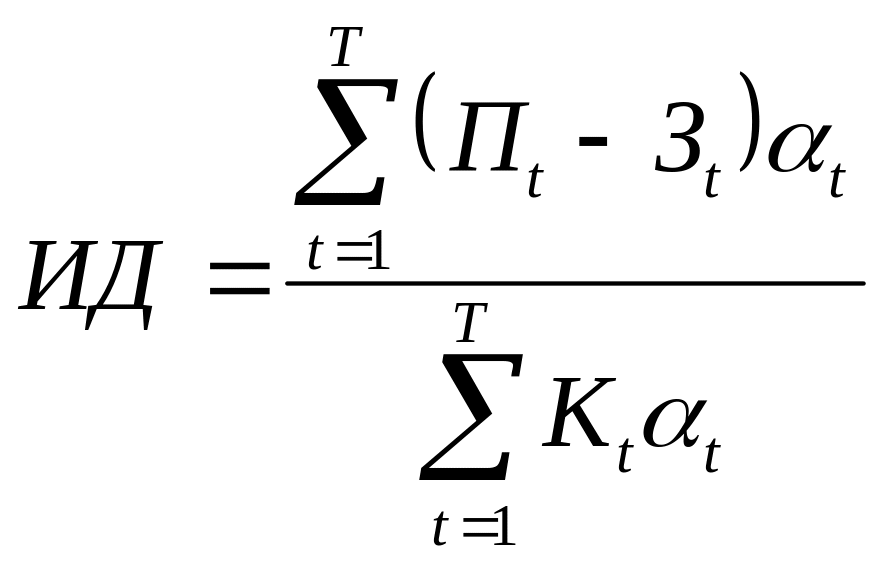 где Т – срок реализации проекта; Пt – поступления от реализации проекта в течение периоде t; Зt – текущие затраты; αt – коэффициент дисконтирования; Кt – капитальные вложения в проект.