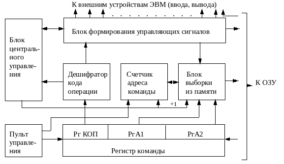 Устройство управления обеспечивает последовательную реализацию команд программы. Адрес очередной выполняемой команды хранится в счетчике адреса команд. По сигналу от блока центрального управления "начать выполнение очередной команды" блок выборки из памяти считывает из ОЗУ очередную команду и записывает ее на временное хранение в регистр команды, в котором можно условно выделить регистр кода операции (РгКОП), регистр первого адреса (РгА1 ) и регистр второго адреса (РгА2). Дешифратор кода команды расшифровывает код операции, а блок формирования управляющих сигналов (БФУС) выдает сигналы, необходимые устройствам ЭВМ (ввода, вывода ВЗУ, АЛУ) для выполнения заданной операции. Если операция является арифметической, то от БФУС сначала поступает сигнал в блок выборки из памяти "считать из ОЗУ значения операндов и записать их в регистры РгА и РгВ арифметическо-логического устройства". Затем подается сигнал в блок управления АЛУ на выполнение этой операции. После чего в счетчик адреса команды добавляется 1 и на этом все действия по выполнению команды заканчиваются. Устройство управления готово приступить к следующей команде, хранящейся в ячейке ОЗУ с адресом на 1 большим адреса предыдущей команды.