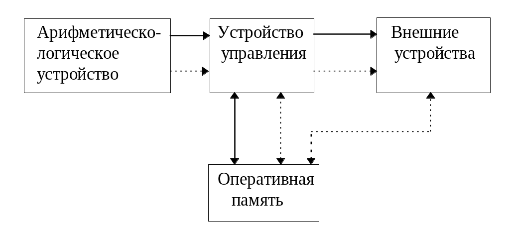 Вот каковы должны быть связи между устройствами компьютера (сплошные линии показывают управляющие связи, пунктирные - информационные) (рис. 4).