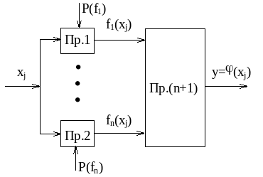 Хорошо видно, что сначала надо вычислить значения всех функций fi, а уж потом их сложить. Вычисление функций fi можно делать параллельно на n процессорах, на что затратится время, необходимое для вычисления самой трудоемкой функции fi (i=1,...,n), и потом сложить n чисел. На рис.1 показана структура такой параллельной вычислительной системы из n процессоров Пр.1, Пр2, ..., Прn, на каждый из которых подается программа вычисления "своей" функции fj (она обозначена P(fj)) и значение аргумента xi. На выходе j-ого процессора Прj таким способом образуется значение fj(xi). Все выходы этих процессоров суммируются на n+1-ом процессоре Пр(n+1). Его программа P() и образует искомую функцию.