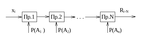 А теперь применим идею конвейера к решению задач, программа которых должна многократно повторяться . Разобьем всю программу А на одинаковые по времени реализации части - подпрограммы (элементарные операции) А1, А2, ..., Аn, последовательное выполнение которых решает поставленную задачу. Теперь N процессов запрограммируем на решение этих подпрограмм и расположим их в цепочку так, что результат работы k-ого процессора будет исходными данными k+1-го (рис.8.9).