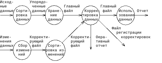 Граф-диаграммы. Иногда называемые графами потоков данных. Каждый кружок на такой диаграмме отображает некоторое преобразование данных. Потоки данных отмечаются стрелками. Этот тип схем можно использовать как на системном уровне для описания внешних входов и выходов программ, так и при проектировании самих программ для описания перемещений данных между отдельными модулями. На рисунке 3.1 представлен пример граф-диаграммы системы сопровождения данных.