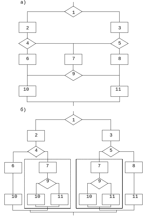 Метод введение дублирующих элементов. Данное преобразование позволяет исключить из блок-схемы варианты передачи управления, не согласующиеся с концепциями структурного программирования, путем введения в неё по определенным правилам дополнительных элементов, эквивалентных уже существующим. Пусть, например, имеется схема, представленная на рис.1.а. Стремление использовать блоки 7, 9, 10, 11 в ветвях, начинающихся в блоках 4 и 5, привело к запутанным связям по управлению. Дублируя блоки 7, 9, 10, 11 можно привести исходную схему к структурированному виду (рис.1.б). При дублировании, строя очередной фрагмент после разветвления, каждый раз вводят необходимые блоки, не обращая внимания на то, что они уже введены на альтернативных участках схемы.