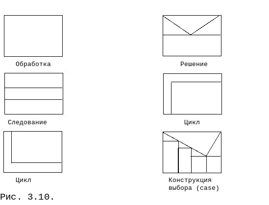 Схемы Насси-Шнейдермана. Способ изображения модуля с помощью схем Насси-Шнейдермана представляет собой попытку использования требований структурного программирования (см. ниже) в структурных схемах модулей. Он позволяет изображать схему передач управления не с помощью явного указания линий переходов по управлению, а с помощью представления вложенности структур. Некоторые из используемых в этом способе символов соответствуют символам структурных схем. Эти символы показаны на рисунке 3.10. Каждый блок имеет форму прямоугольника и может быть вписан в любой внутренний прямоугольник любого другого блока. Блоки помечаются тем же способом, что и блоки структурных схем, т.е. с использованием предложений на естественном языке или с помощью математических нотаций. Если использовать символы схем Насси-Шнейдермана одновременно с дополнительными символами структурных схем для изображения множественных выходов и обработки прерываний, то представление рассматриваемого модуля может быть упрощенно.