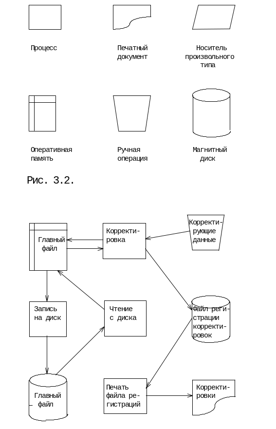 Функциональные схемы. Функциональная схема системы состоит из одного или нескольких прямоугольных блоков, содержащих названия программ. Эти блоки соединяются входящими в них стрелками с источниками и исходящими из них стрелками - с приемниками данных. Источники и приемники изображаются в виде блоков, очертания которых напоминают определенные физические носители информации (некоторые блоки представлены на рис. 3.2). В каждом блоке записано имя программы или набора данных, иногда оно дополняется информацией, раскрывающей назначение блока. Основное внимание в схемах этого типа уделяется описанию потоков данных в системе и используемых наборов данных. На рисунке 3.3. изображена функциональная схема фрагмента системы корректировки главного файлов.