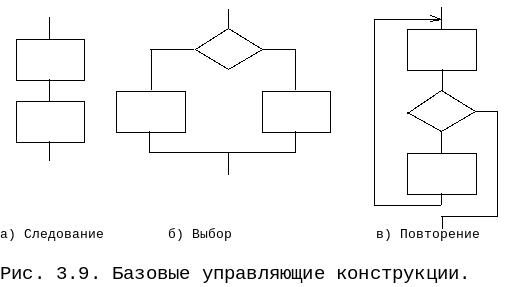 Структурные схемы можно применять на любом уровне абстракции. Основная тенденция в использовании структурных схем в настоящее время - не указание последовательности операций, а группирование символов, выражающих базовые конструкции: следование, выбор, повторение. На рис. 3.9 показаны схемы этих управляющих конструкций.