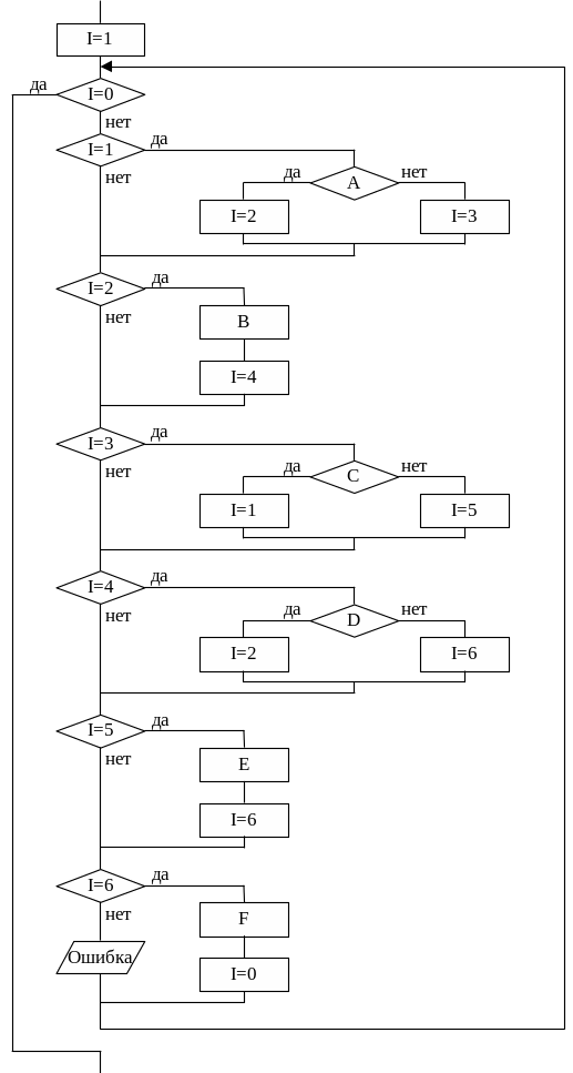 Строится новая схема в виде цикла с предусловием с вложенными в него блоками «Решение» для анализа переменной состояния и блоками исходной схемы, к каждому из которых добавлены соответствующие элементы изменения значений переменной состояния. Перед циклом добавляется блок для присвоения единицы переменной состояния, а условием выхода из цикла является равенство значения переменной нулю.