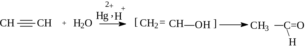 Важной реакцией алкинов является гидратация тройной связи, катализируемая кислотой и солями ртути. При этом из aцетилена получается этаналь: