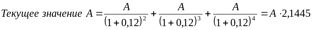 Если в конце года компания получает А ф.ст. и рассчитывает на 12% годового прироста, то тогда сегодняшнее (текущее) значение А ф.ст. для 2-4 года работы будет равно