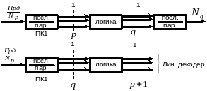 НЦП передачи строится по схеме (а), изображенной ниже. Преобразователи кода (ПК) выполнены на триггерах. Логика переписывает состояние триггеров p на триггеры q по таблицам преобразования. Затем код последовательно списывается с q триггеров и посылается в канал связи. НЦП приема (б) строится проще, поскольку на линейный декодер требуется подавать число Np в параллельном коде.