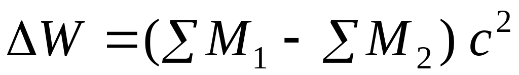 где M1—сумма масс частиц до реакции и M2—сумма масс частиц после реакции. Если M1 > M2, то реакция идет с выделением энергии, если же M1 < M2, то реакция идет с поглощением энергии. Отметим, что в последнюю формулу так же, как и при вычислении энергии связи ядра, мы можем подставлять массу изотопов, а не ядер, так как поправки на массу электронов оболочки входят с разными знаками и поэтому исключаются.
