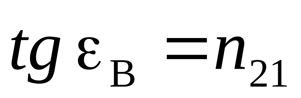 где B — угол падения, при котором отразившийся от диэлектрика луч полностью поляризован; n21 — относительный показатель преломления второй среды относительно первой.