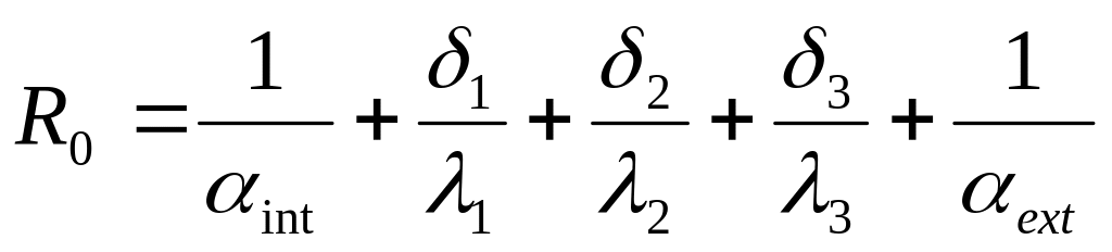 Далее определяем приведенное сопротивление теплопередаче R0, м2·0С/Вт, заданной многослойной О.К., которое должно быть не менее нормируемого значения Rreg, м2·0С/Вт. R0 находим как сумму термических сопротивлений отдельных слоев с учетом сопротивлений теплопередаче внутренней и наружной поверхностей О.К. (Rsi и Rse) по формуле: