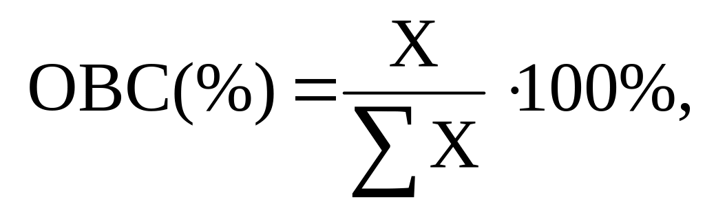 - относительные величины структуры. Они характеризуют отношение отдельных частей к целому, дают возможность изучить состав (строение) совокупности. Расчет относительных величин структуры (ОВС) сводится к исчислению удельных весов отдельных частей в коэффициентах или в процентах ко всей статистической совокупности