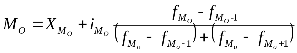 В дискретных рядах распределений мода определяется величиной показателя имеющего наибольшую частоту. В интервальных рядах для вычисления моды используется следующая формула:
