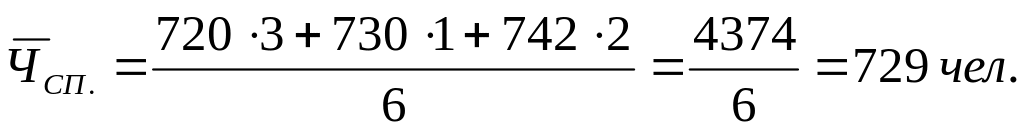 Задача 12.3. Определить среднюю списочную численность работающих в автотранспортном предприятии за первое полугодие. Средняя списочная численность работающих за каждый месяц составила: январь, февраль, март – 720 чел., апрель – 730 чел., май, июнь – 742 чел.
