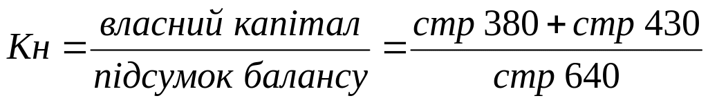 Коефіцієнт незалежності характеризує частку власного капіталу в структурі всього капіталу підприємства і таким чином визначає співвідношення інтересів власників підприємства й кредиторів. Розраховується за формулою
