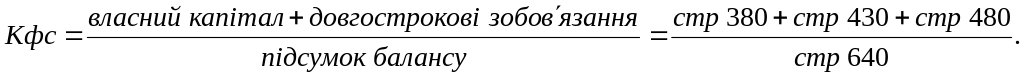 Коефіцієнт фінансової стабільності характеризує частку тих джерел фінансування, які підприємство може використовувати у своїй діяльності тривалий час (більше від одного року). Розраховується за формулою: