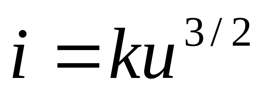 В первом приближении можно считать, что при анодном напряжении, равном нулю или отрицательному значению, анодный ток диода равен нулю. При положительных напряжениях электроны, достигающие анода, образуют анодный ток, который можно считать подчиняющимся закону степени трех вторых, т. е. пропорциональным анодному напряжению в степени три вторых: