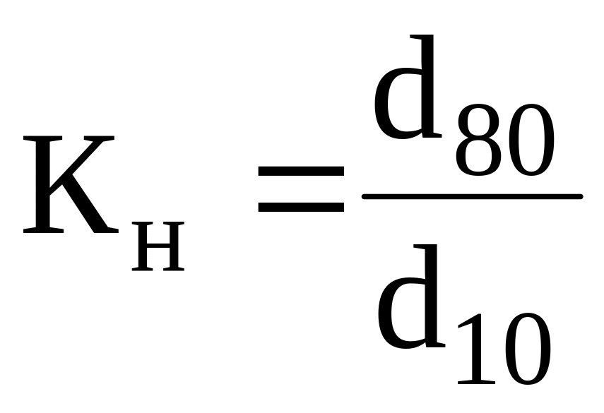 где d80, d10 – диаметры зерен, мм, соответствующие 80- и 10-процентному калибру.