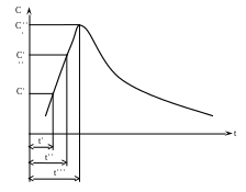 Действительное время пребывания воды в сооружениях определяется экспериментально – путем введения в воду меченого элемента (солей, краски) и последующего контроля за выходом его из сооружения. Лучшие результаты получаются при использовании в опытах красителей, например, флюоросцеина. Изменение концентрации меченых элементов в выходящей воде с изменением времени представляется в виде графика (рисунок 1.1).