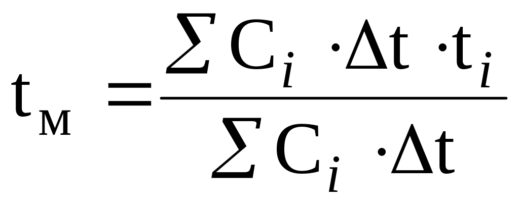 Действительное время пребывания воды в сооружении равно величине абсциссы центра тяжести площади фигуры, ограниченной кривой изменения концентрации меченого элемента в выходящей воде с осью абсцисс.