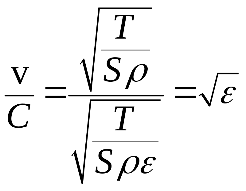 Найдём отношение скорости волны в натянутой струне v к скорости упругих колебаний C. Разделив (5) на (7), получим (при одинаковых напряжениях):