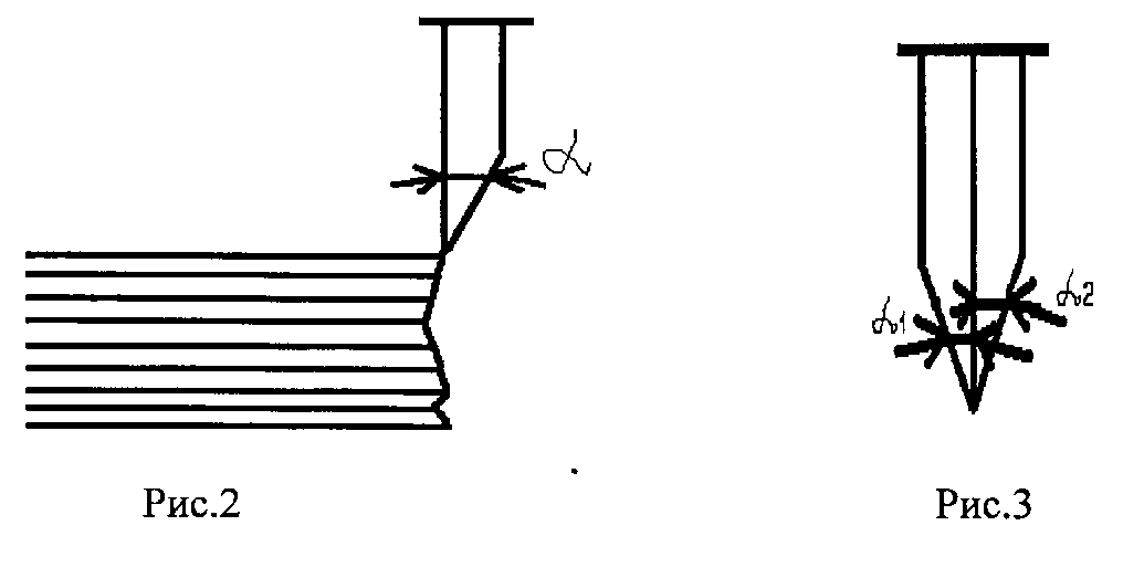При раздвигании резаком волокон возникают силы, которые растягивают материал, а, достигнув определенной величины, разрывают еще не разрезанные лезвием волокна. При большом угле заострения силы, разрывающие материал появляются раньше, чем при меньшем угле, и, следовательно, край детали получается менее чистым и не вертикальным (рис.2).