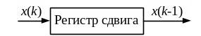 Для дискретных систем в схемах с переменными состояния используется регистр сдвига (рис. 11.1а), который заменяет интегратор непрерывных систем. Через каждый интервал дискретности в момент времени t = kTП в регистр сдвига записывается новое число x(k), а число x(k-1), которое ранее хранилось в регистре, выводится из него. Изображение такого элемента памяти представлено на рис. 11.1б.
