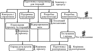 Рис. 3.8. Розподіл робіт між різними дисциплінами в проекті по RUP