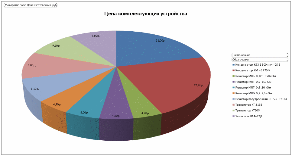 Рассчитать устройство со сроком годности не менее 7 лет (дата изготовления – 14.04.05 г.) и его цену. Построить диаграмму, показывающую цену каждой комплектующей в этом устройстве.
