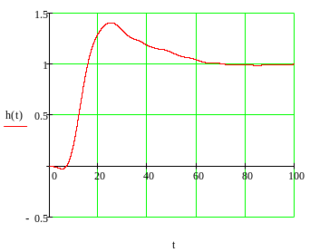 Висновок: в ході роботи провів апроксимацію передаточної функції об’єкту управління ланкою першого порядку з запізненням і використовуючи формульний метод знайшов параметри настроювань стандартного ПІД-регулятора. Побудував перехідну характеристику системи з стандартним регулятором та визначив показники якості які покращились у порівнянні з розрахованими у пункті 3, але не відповідають заданому показнику ступені затухання перехідного процесу.