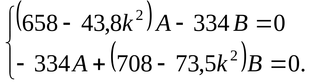 где k- неизвестная частота колебаний, А и В – неизвестные постоянные (амплитуды колебаний). После подстановки решения (1.7) в уравнения (1.6), получим систему двух однородных алгебраических уравнений относительно постоянных А и В