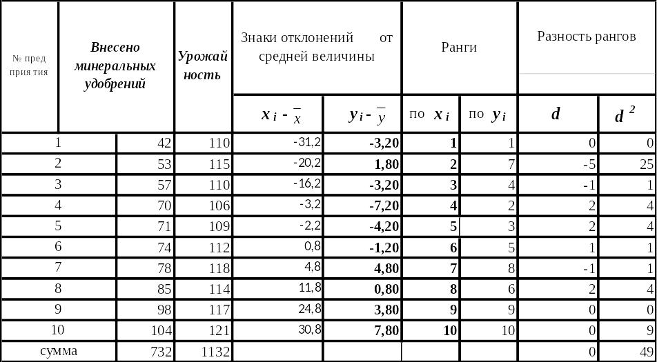Исходя из выше указанного можно сделать следующий вывод , показатель Фехнера свидетельствует о прямой связи между внесением минеральных удобрений и урожайностью, значения коэффициента Спирмена также говорит о наличии полной связи между сопоставляемыми признаками , т.е x оказывает влияние на y .