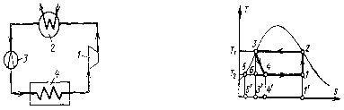 В рефрижераторе 4 этот пар отбирает тепло от охлаждаемого объекта и подсушивается при постоянных давлении р2 и температуре Т2 по линии 4-1, чем цикл и завершается.