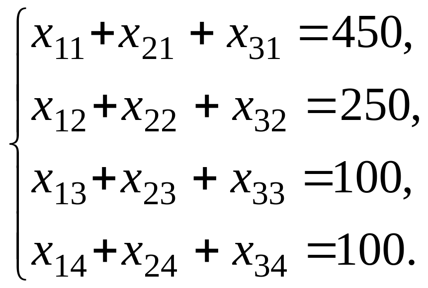 - все потребности в грузе должны быть удовлетворены. Получаем следующую систему уравнений: