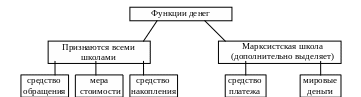 Современная экономическая наука сущность денег выводит из их функций. Большинство экономистов признают за деньгами выполнение трех функций: средство обращения, мера стоимости, средство накопления. Согласно учению К.Маркса в дополнение к рассматриваемым выделяют еще две функции (рис.1).