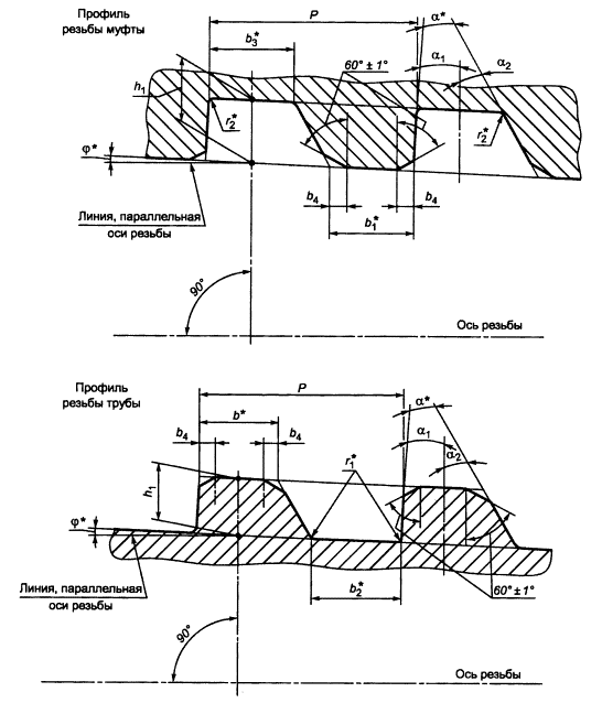 α - угол профиля; α1, α2 - углы наклона сторон профиля; b - ширина вершин профиля трубы, b1 - ширина вершин профиля муфты; b2 - ширина впадин профиля трубы; b3 - ширина впадин профиля муфты; φ - угол уклона резьбы; h1 - высота профиля; Р - шаг резьбы; r, r3 - радиусы скругления вершин профиля; r1, r4 - радиусы округления впадин профиля