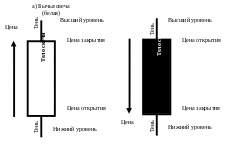 Японские подсвечники, в отличие от западных биржевых чартов, большое внимание уделяют связи между ценами открытия и закрытия, показывая эту связь совершенно уникальным образом. Наиболее часто свечи строят на ежедневных графиках, так как вся технологическая подоплека прогнозирования на свечах основана на соотношении цены при открытии и закрытии одного и того же дня, а также цены закрытия предыдущего дня и открытия следующего. Расстояние между ценой открытия и закрытия формирует тело свечи, причем если рынок закрылся выше по сравнению с открытием, то тело свечи оставляется белым, и, наоборот, при падающем рынке тело свечи заполняется черным цветом. Тонкие линии выше и ниже реального тела – тени – отражают максимальную и минимальную цены за период.