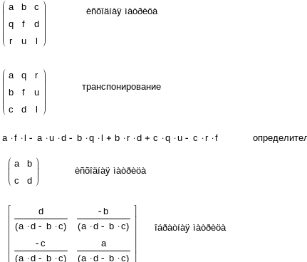 Матричные операции транспонирование (Transpose), обратная матрица (Invert) и определитель (Determinant) можно организовать с помощью пункта меню Symvoics → Matrix → Transpose (Invert, Determinant). Предварительно необходимо ввести матрицу, выделить её и выполнить соответствующую операцию нажатием левой мыши. Результат появляется ниже ввода исходной матрицы (рис. 2):