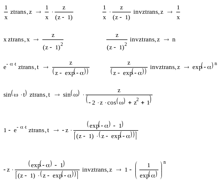 Применяется при анализе цифровых систем управления и играет такую же роль, как и преобразование Лапласа в непрерывных системах. В Mathcad выполняется аналогично преобразованию Лапласа с помощью панели главного меню Symvolics → Z или математической панели Symvolic → ztrans. Для обратного z-преобразования используются операторы Symvolics → Inverse Z или Symvolic → invztrans (рис. 8).