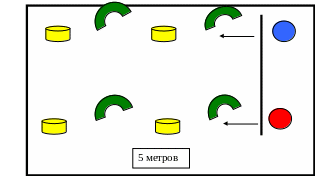 Перед командами, стоящими в колоннах (по 8-10 человек), проводится стартовая линия, а в 10-12 м от каждой из них ставятся стойки или кладутся набивные мячи.